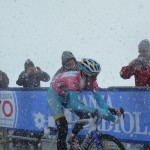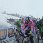 What a terrible day, the weather was nasty, cold ,and a lot of snow. All this did not deterred the many passionates like me from reaching the finish at 3 Cime di Lavaredo over 2.000 meters above sea level. The day was not the best to party as it usually happens on such occasions, and the cheering and chanting was a little bit undermined by the weather conditions, but as the riders started the climb the shouting increased, because on such a day everybody was a winner and a hero. The mountains were envelopped in a thick veil of clouds that eventually openend up during the day to make the spectator marvel such a beatiful wonder of nature. The white mantel was reflecting the sun rays, that for a moment I tought of being at the beach, as it was dazzling all around me. The dream did not last long as the fog first and the clouds later brought the winter among us very quickly. The weather demonstrated its bad temperament short before Nibali emerged from the storm, and fog. The riders were to be spotted alomost at the last minute as the storm, and the snow was so intense, that it caught everyone by surprise, the temperature dropped, and we were harmless in front of this force of nature. In a few minutes 10 cm of fresh snow were piling on top of the meters fallen the days before. The riders were all exhausted, just heading to the finish with all of their strength, just to get away from the snow. They were all very brave, wise, and devoted to their job, that sometimes is to be done in unconfotable conditions. None of them was complaining, I would say everyone fighting the storm on his own, in such a silence, and diligence, that makes cycling great. A man left to fend off weather, opponents, all on his own. A great day of cycling, that reminded me of the past, when I look at the times of Bartali and Coppi. Dear Cyclists world wide let’s make sure that this sport remains the best expression of a man’ strength, and pride, by keeping it so simple, and pass the passion onto the new generations.